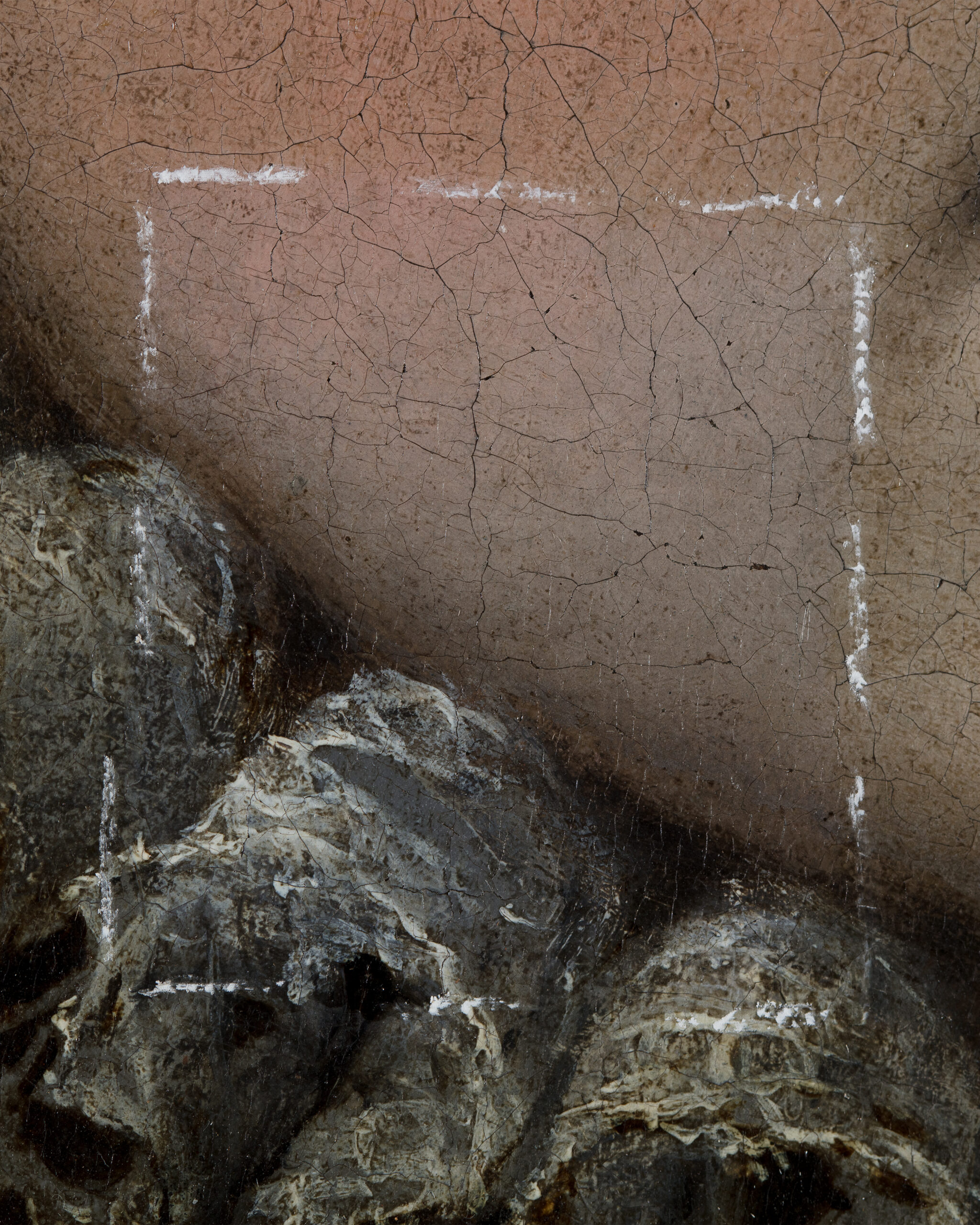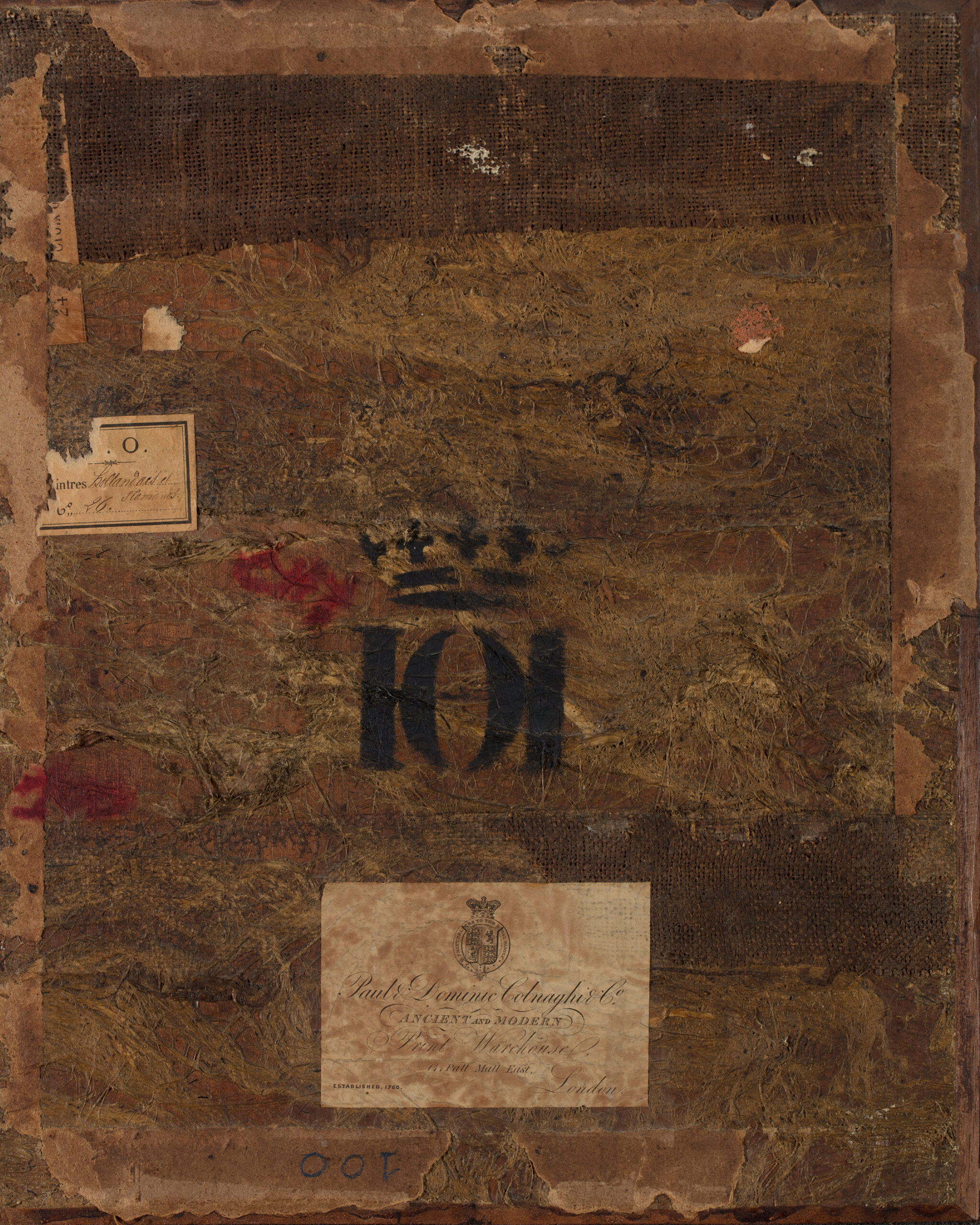 Le revers du tableau révèle des inscriptions et des tampons qui témoignent de son histoire de collection et de ses conditions de conservation. Une analyse approfondie, menée par réflectographie infrarouge avant la restauration, n’a révélé aucune esquisse préparatoire, bien que l’on ne puisse exclure la présence de dessins à la sanguine ou à la craie, invisibles à cette technique.