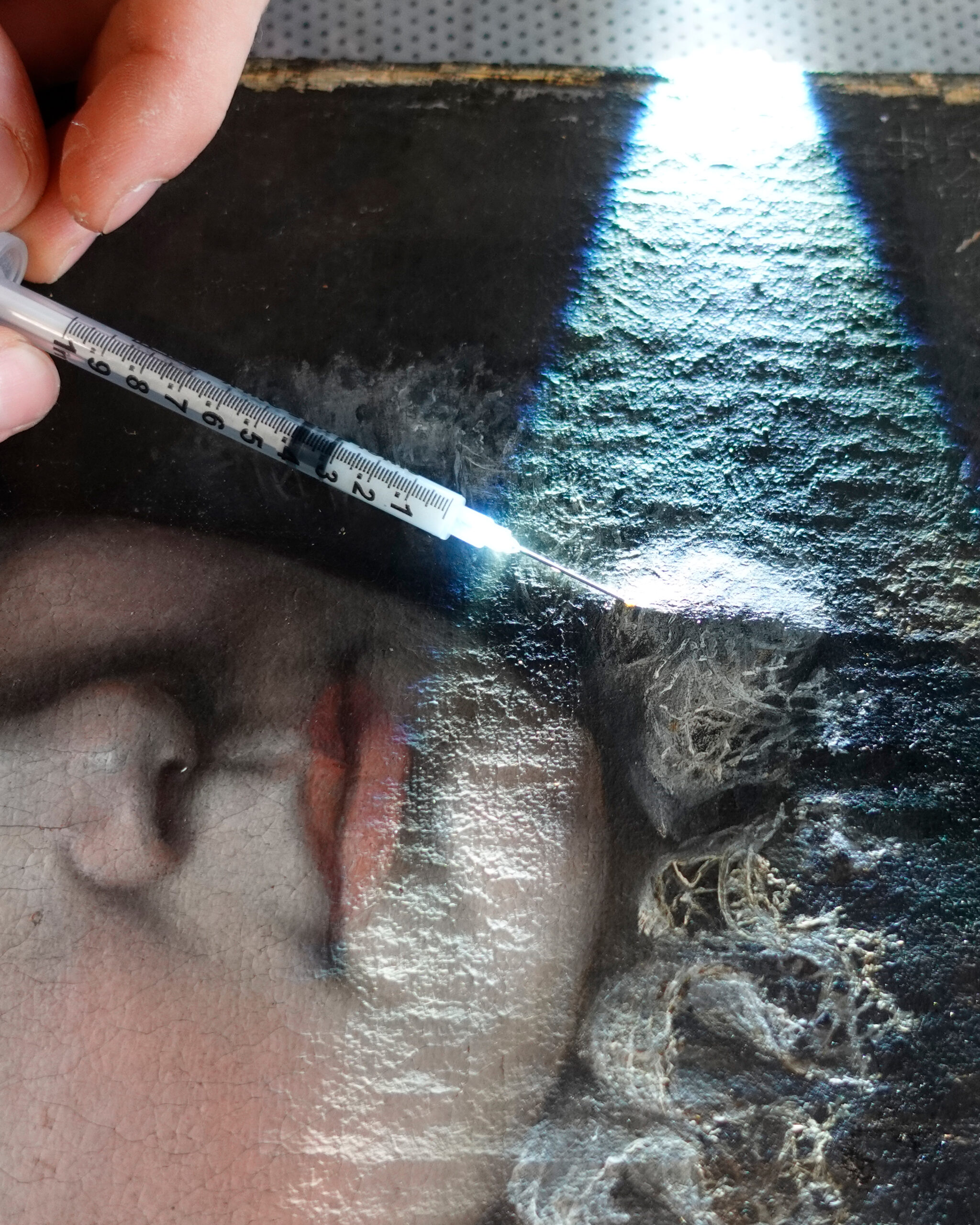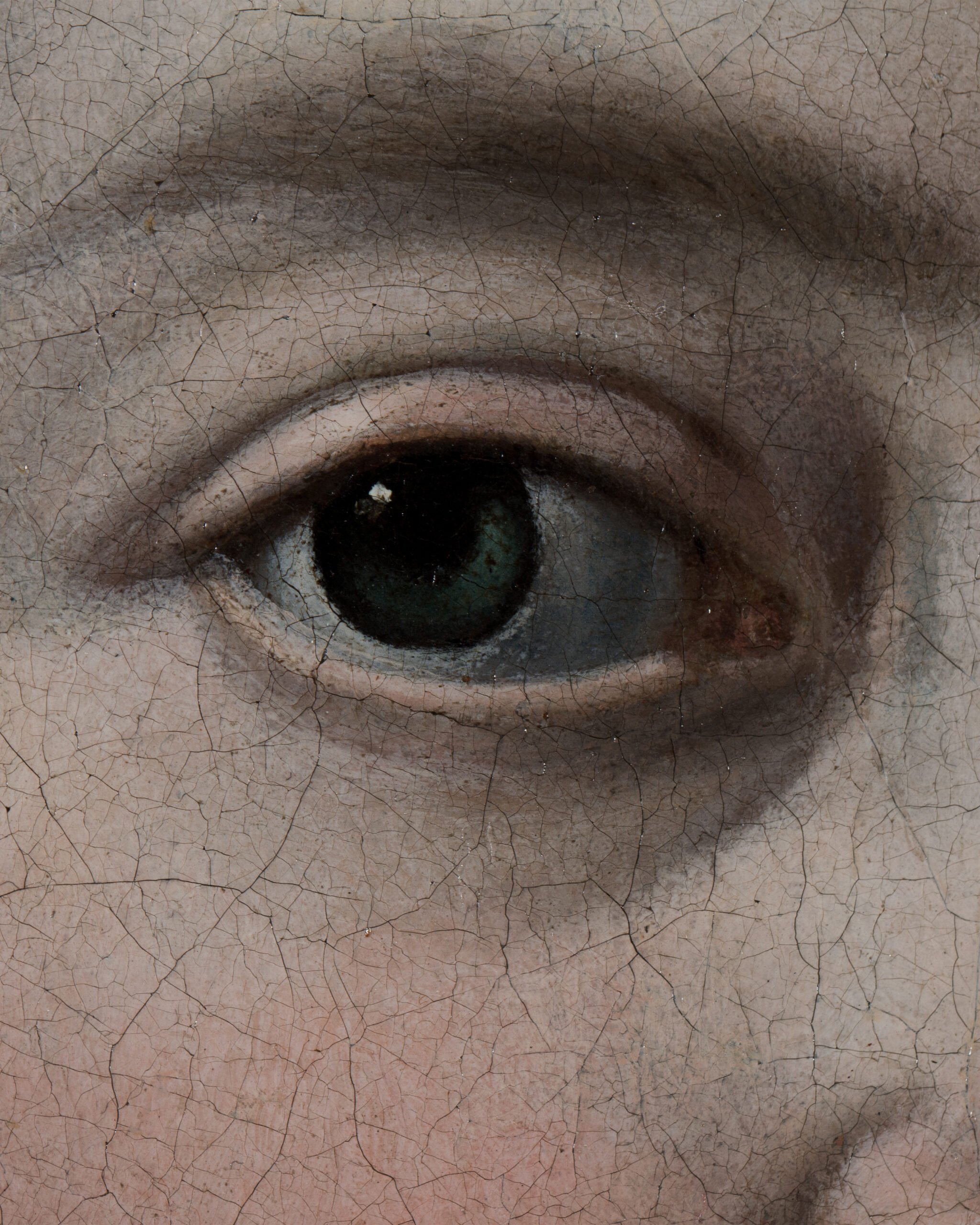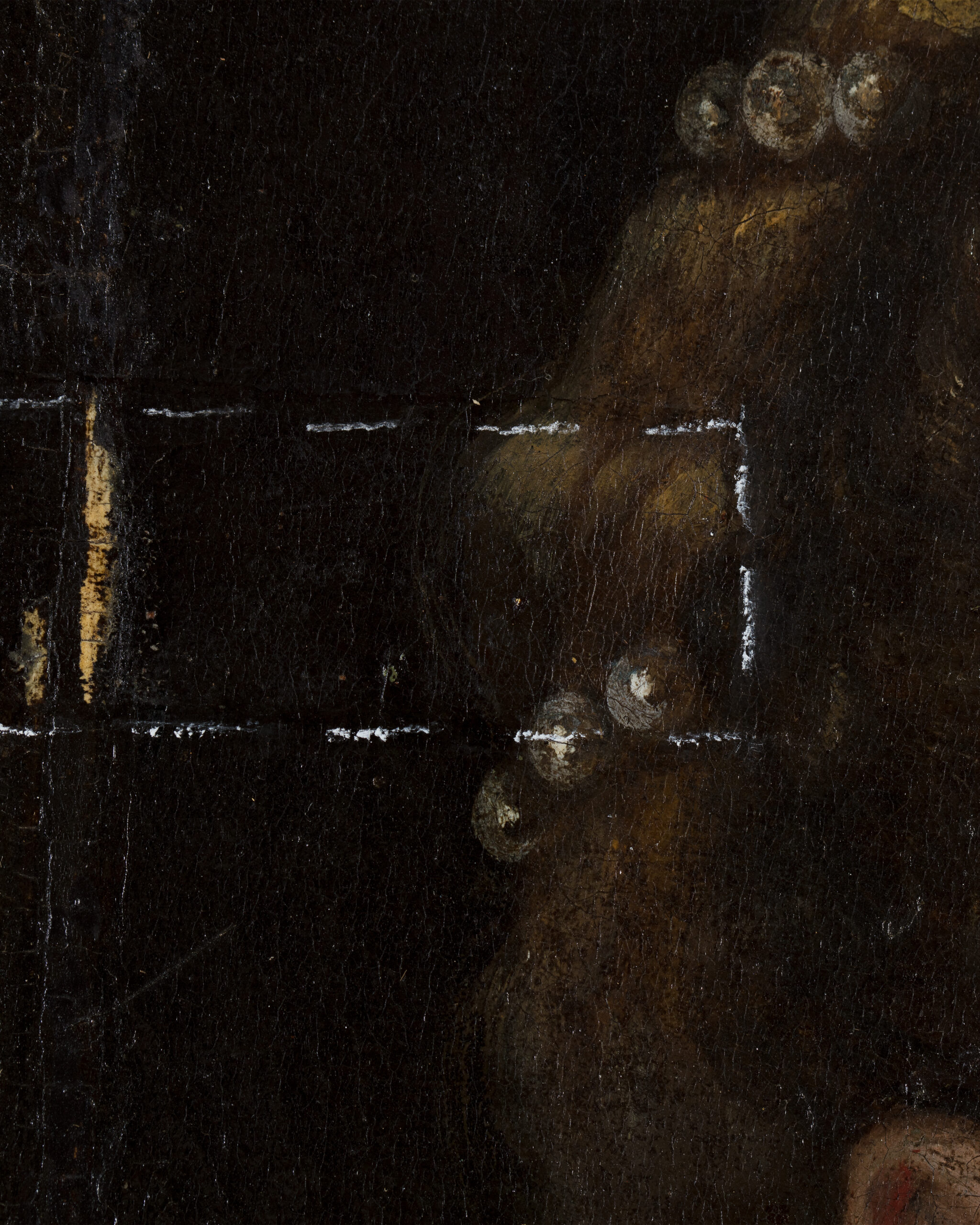 La peinture elle-même est exécutée avec une pâte fine, excepté dans les détails les plus minutieux, comme les dentelles, les bijoux ou les broderies, où l’artiste a employé une touche plus épaisse. Avant sa restauration soignée, l’œuvre présentait un état de conservation modéré, marqué par un réseau de fines craquelures, surtout dans les zones claires contenant du blanc, telles que les carnations. Ces craquelures étaient accompagnées de micro-lacunes visibles aux intersections des fissures.
