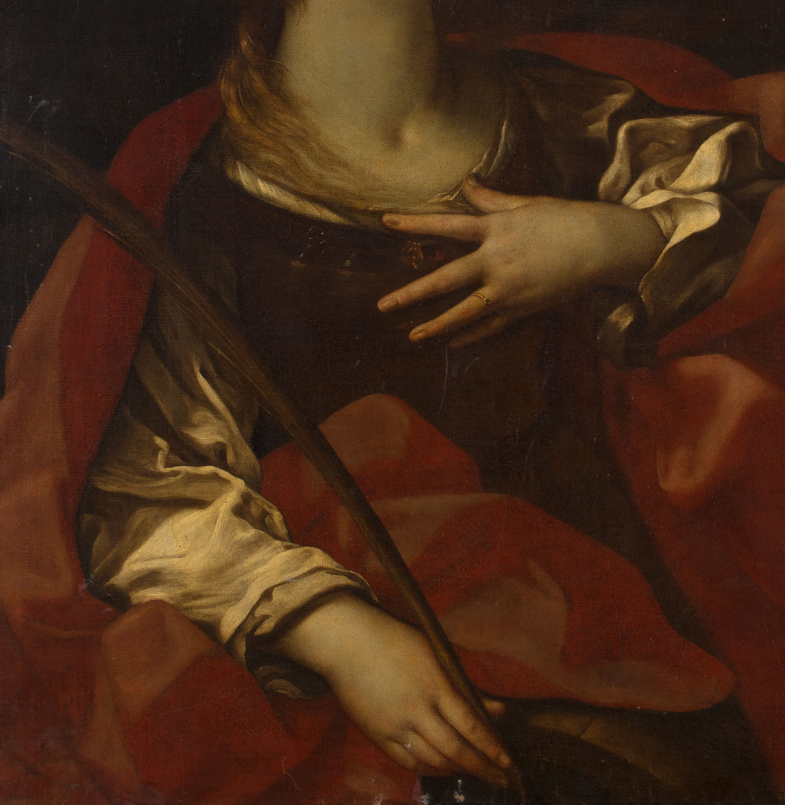 L’iconographie rappelle très clairement sainte Catherine d’Alexandrie. La palme du martyre, la roue brisée reconnaissable au bas de la composition et le regard levé vers la vision céleste structurent la lecture. Le putto dans la nuée apporte une couronne, signe de victoire spirituelle, tandis que la main droite posée sur la poitrine et l’anneau au doigt évoquent la tradition des noces mystiques. Le manteau rouge et la soie lumineuse des manches soulignent la noblesse de la sainte.