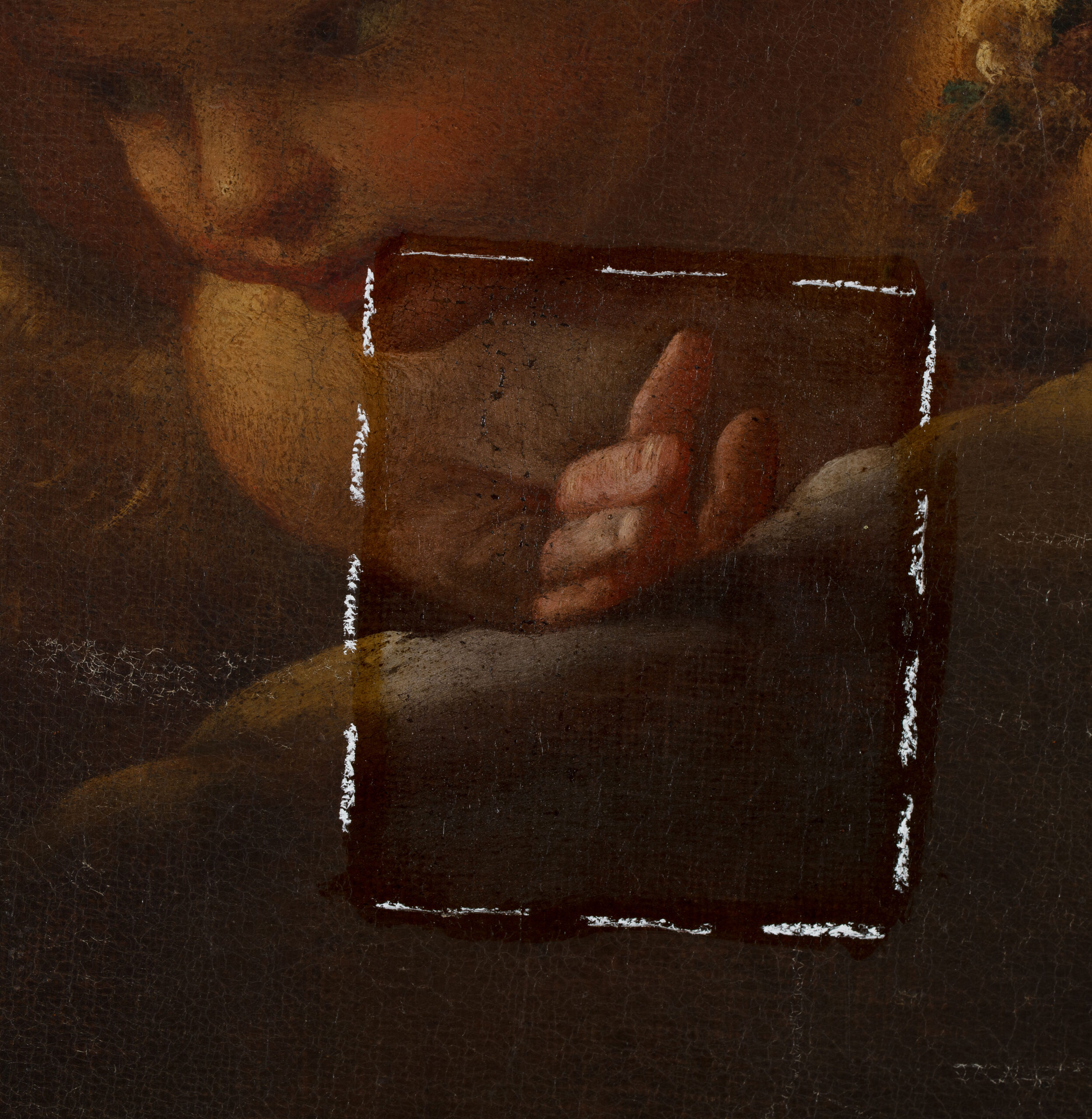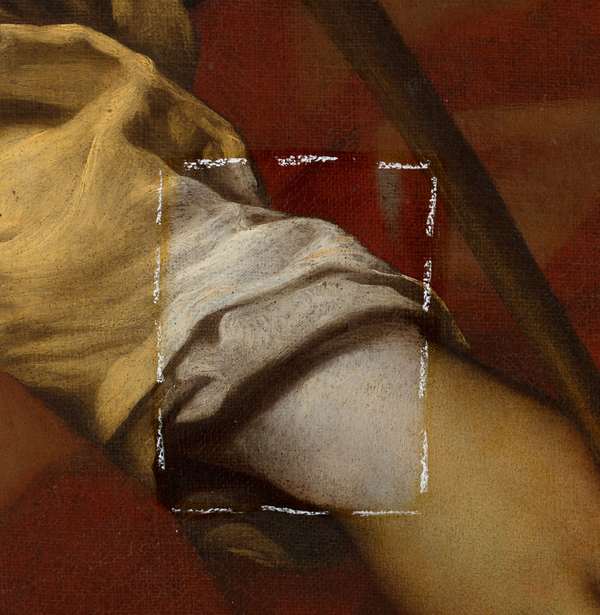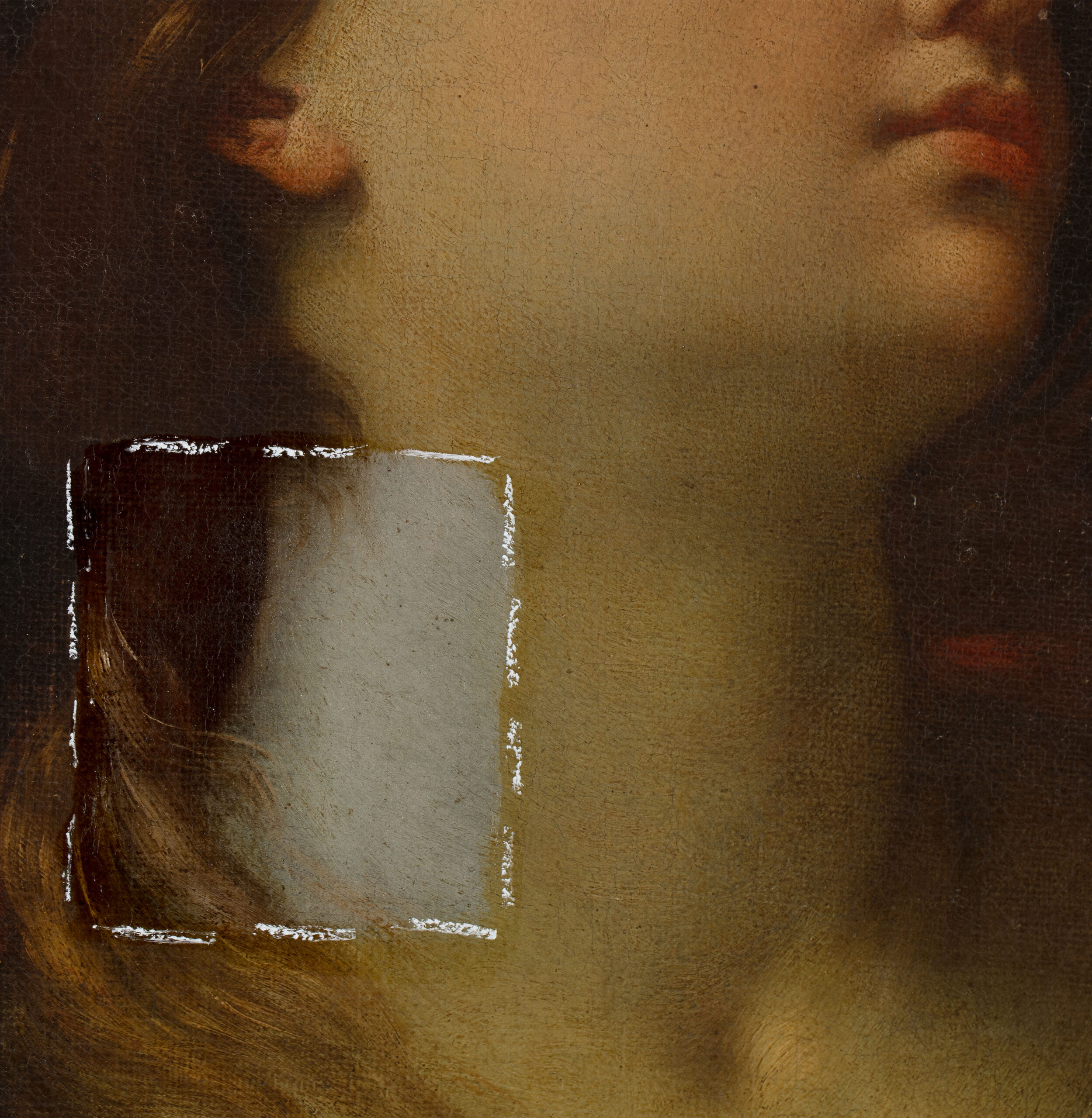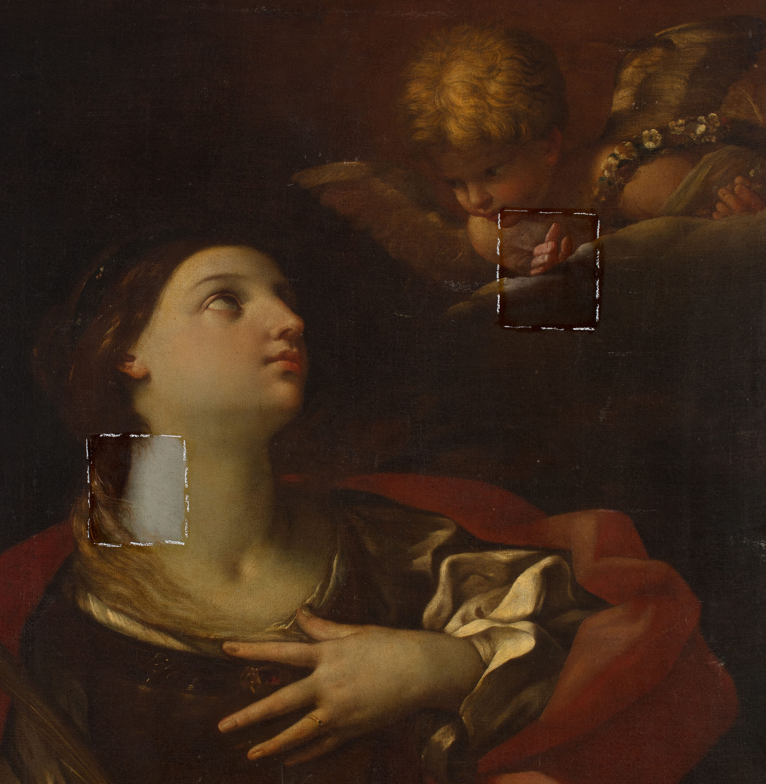 La restauration en cours a mis en évidence un vernis très oxydé qui ternissait fortement les carnations, les drapés et le ciel. Les fenêtres de test confirment que les glacis d’origine sont bien conservés sous l’encrassement et que le modelé des chairs retrouve sa douceur dès l’allégement. L’intervention se poursuit par un amincissement très contrôlé, conduit zone par zone. Le but de la restauration est de restituer la clarté des valeurs et l’équilibre des lumières propres au langage de l’atelier de Guido Reni, conditions nécessaires à la pleine compréhension du sujet et à la qualité contemplative de l’œuvre.